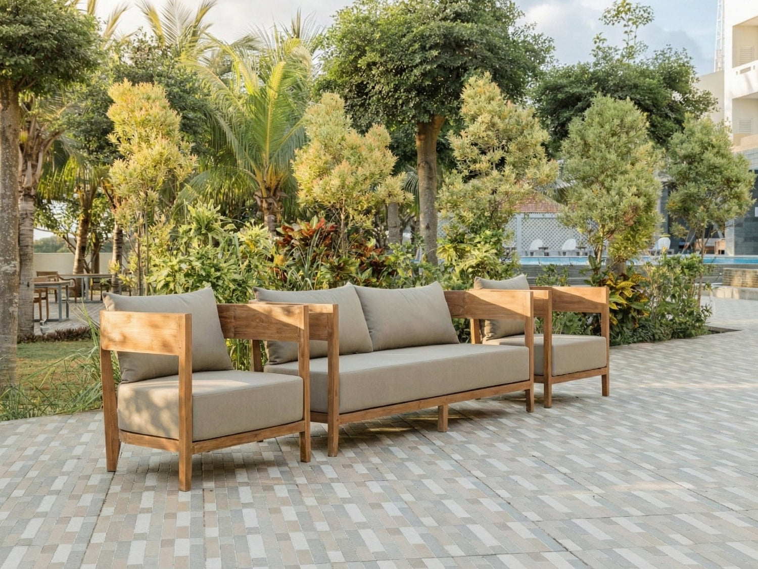 Das warme, honigfarbene Teakholz verleiht dem Set eine natürliche Ausstrahlung und luxuriöse Optik, während die klaren, zeitlosen Linien für moderne Eleganz sorgen. Die Kombination aus robustem Massivholz und durchdachtem Design macht Lura zu einem echten Blickfang in jedem Außenbereich.