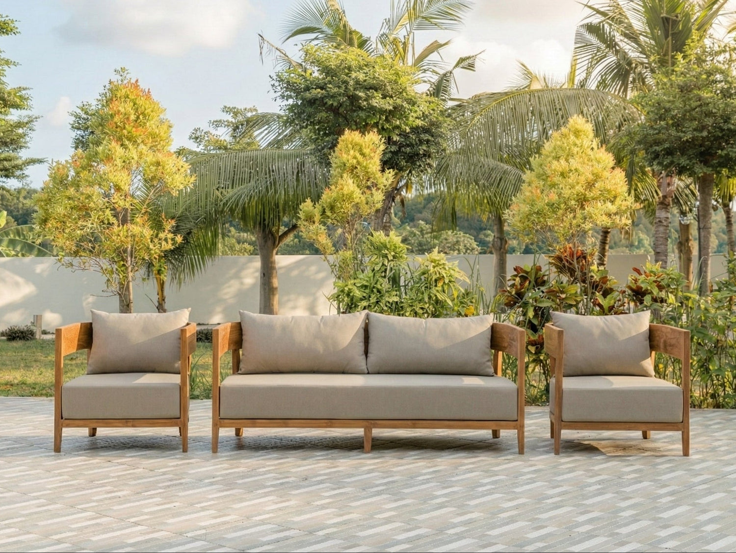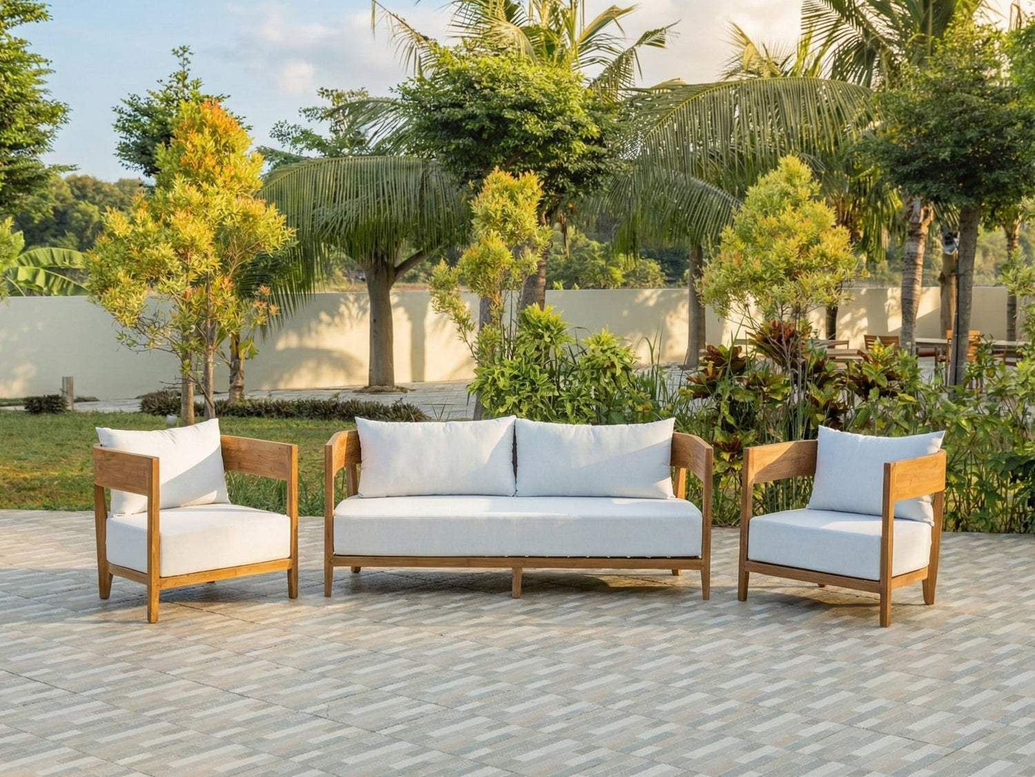 Das Lura Lounge-Set ist die perfekte Wahl für alle, die Wert auf Qualität, Stil und Langlebigkeit legen. Dieses elegante Set besteht aus einem großzügigen 188 cm langen Lounge-Sofa und zwei komfortablen Sesseln – alle aus massivem Teakholz gefertigt. Ideal für Garten, Terrasse oder Veranda.